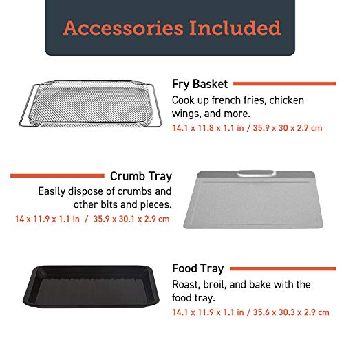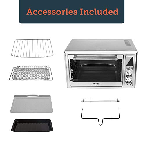 Accessories: crumb tray, air fryer basket, food tray, wire rack, rotisserie fork set, and rotisserie handle included. Enjoy delicious food by included recipes written by COSORI Pro chefs. Easy to Clean: sleek brushed stainless steel appearance, solid nonstick interior, and high-quality glass door, the appliance could be cleaned up with moist mop. Removable crumb tray helps avoid stains and other buildup. ETL listed, just go and enjoy healthy delicacy here!