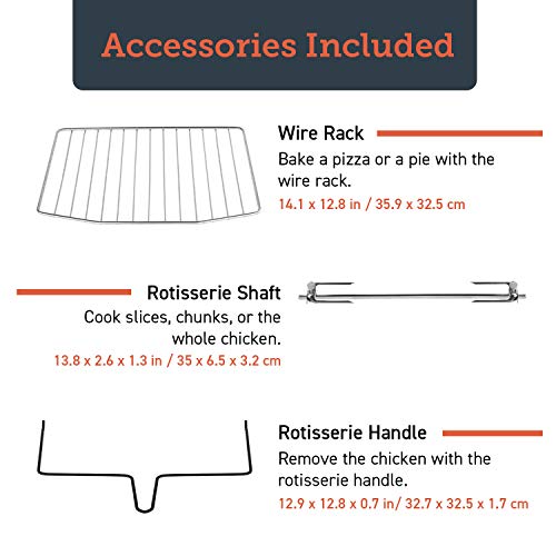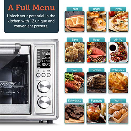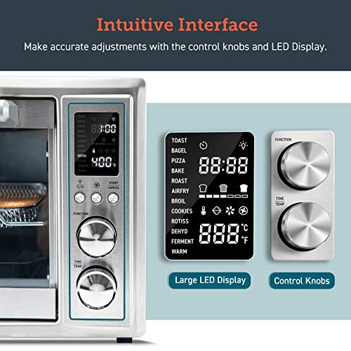 LED display: high-precision LED screen for clear reading; quick to arrive at the 12 functions, time, temperature settings with the easy dial controls. Interior light will turn on automatically 1 minute before the cooking is done, press button to manually turn the light back off. Fully Equipped
