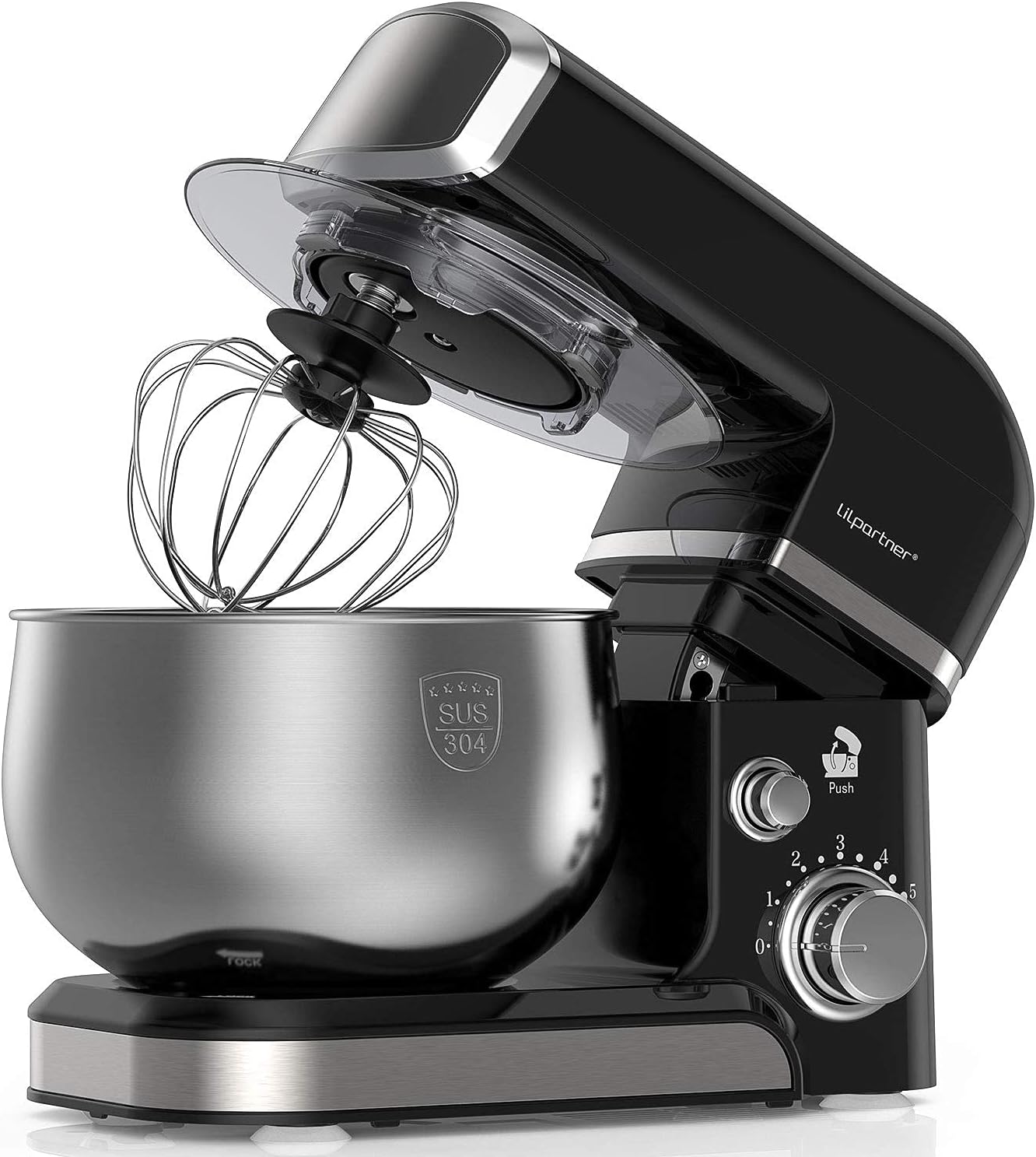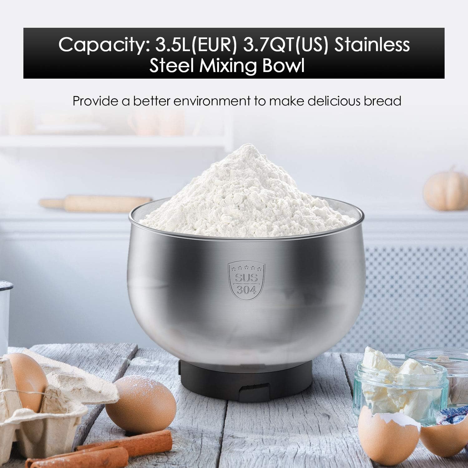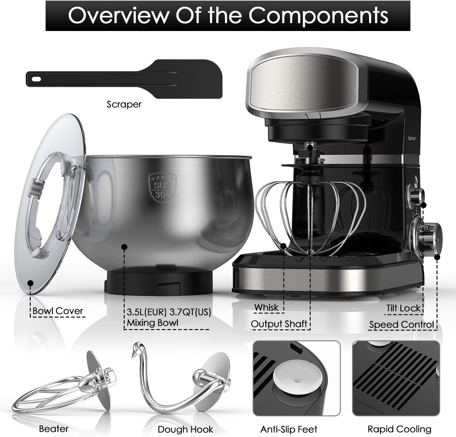 3.7Qt stand mixer comes with 304 stainless steel bowl with comfortable operation offering sufficient capacity. Multipurpose attachments are included stainless steel whisk, aluminum dough hook, aluminum beater, splash guard and scraper which are easily fixed on the shaft, increasing the versatility of the cooking mixture to completely mix the ingredients.