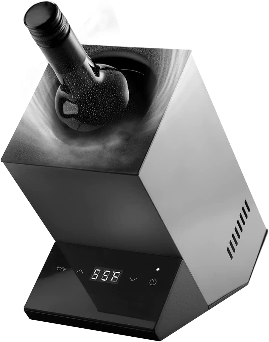 Simple Elegant Stainless Steel Design with Digital Controls – The wine cooler can hold a single 750ml standard-sized wine bottle. white, rose, red, sweet, etc.This little on demand bottle cooler makes it perfect for use in a small kitchen, backyard, car camping,restaurant,club etc. Fits most traditional champagne bottles like Veuve Clicquot, Moët & Chandon, Louis Roederer, and many more.