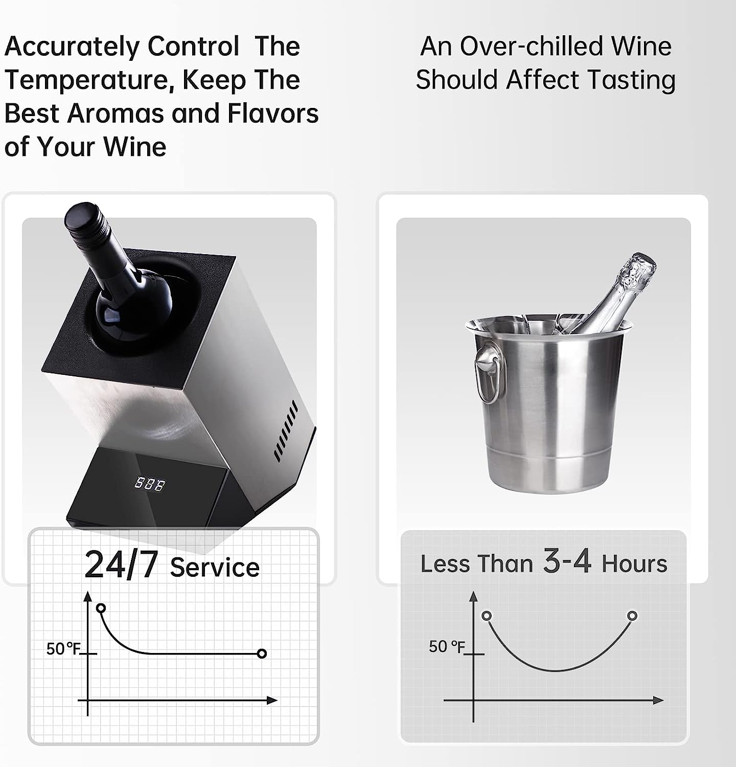 Keeps Wine at The Ideal Temperature – Cobalance tech novelty wine bottle chiller enables to keep wine bottles refreshing for up to 24 hours at the target temperature indoors or outdoors, easily getting red wines to their appropriate temperature of “cellar” temperature 59-64℉ or getting white wines & champagnes close to fridge freezing cold 41 ℉ while keeping it 24 hours